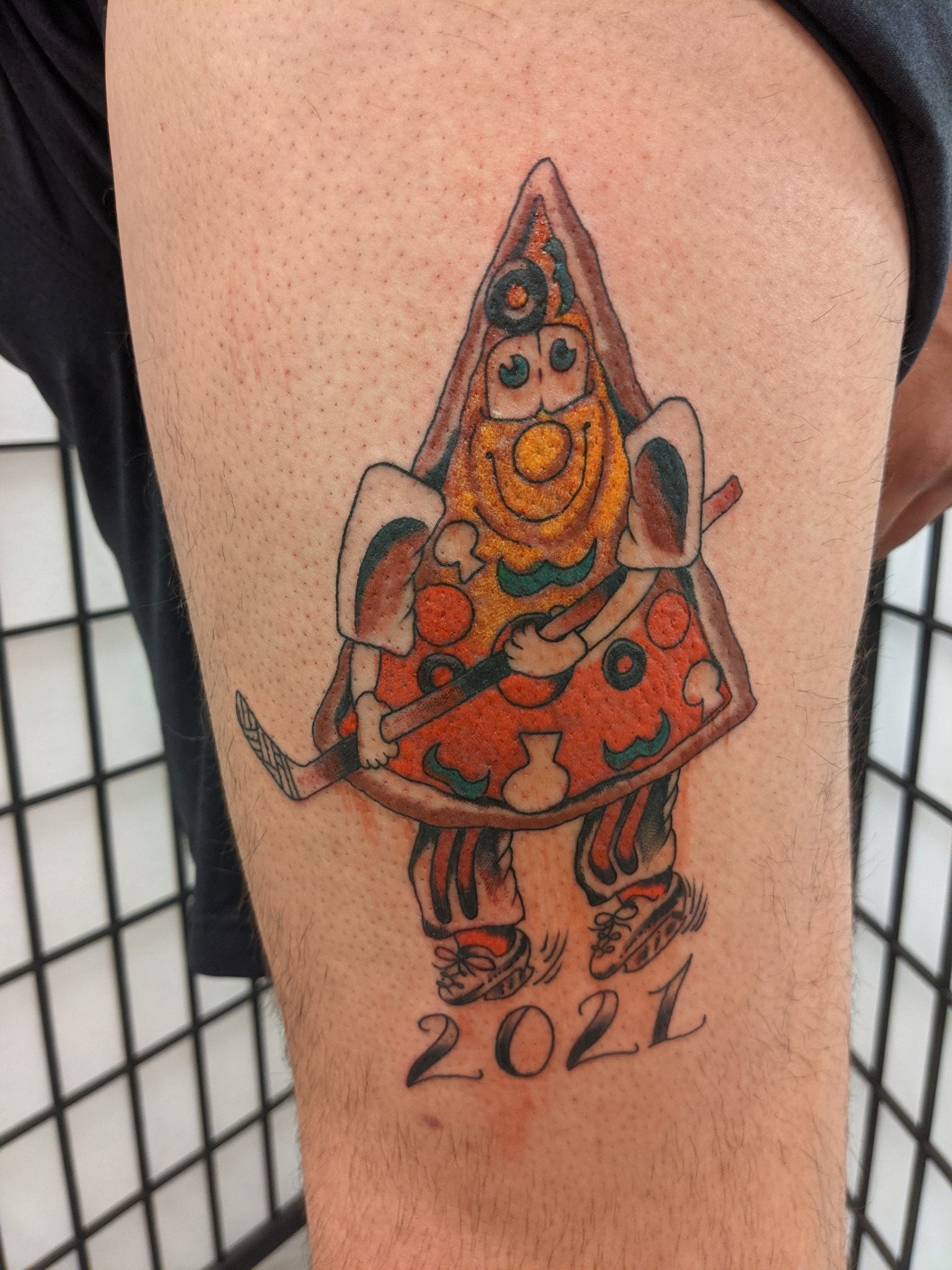 But this was no mere victory tattoo that Blindspots got. It wasn’t plain words or his team’s name or something small. Matter of fact, the tattoo isn’t even of UMass. No the tattoo, that stands in large depiction on his leg and will rightfully immortalize him amongst UMass faithful is, of Mr. Slice on ice skates holding a hockey stick with 2021 written under the skates.